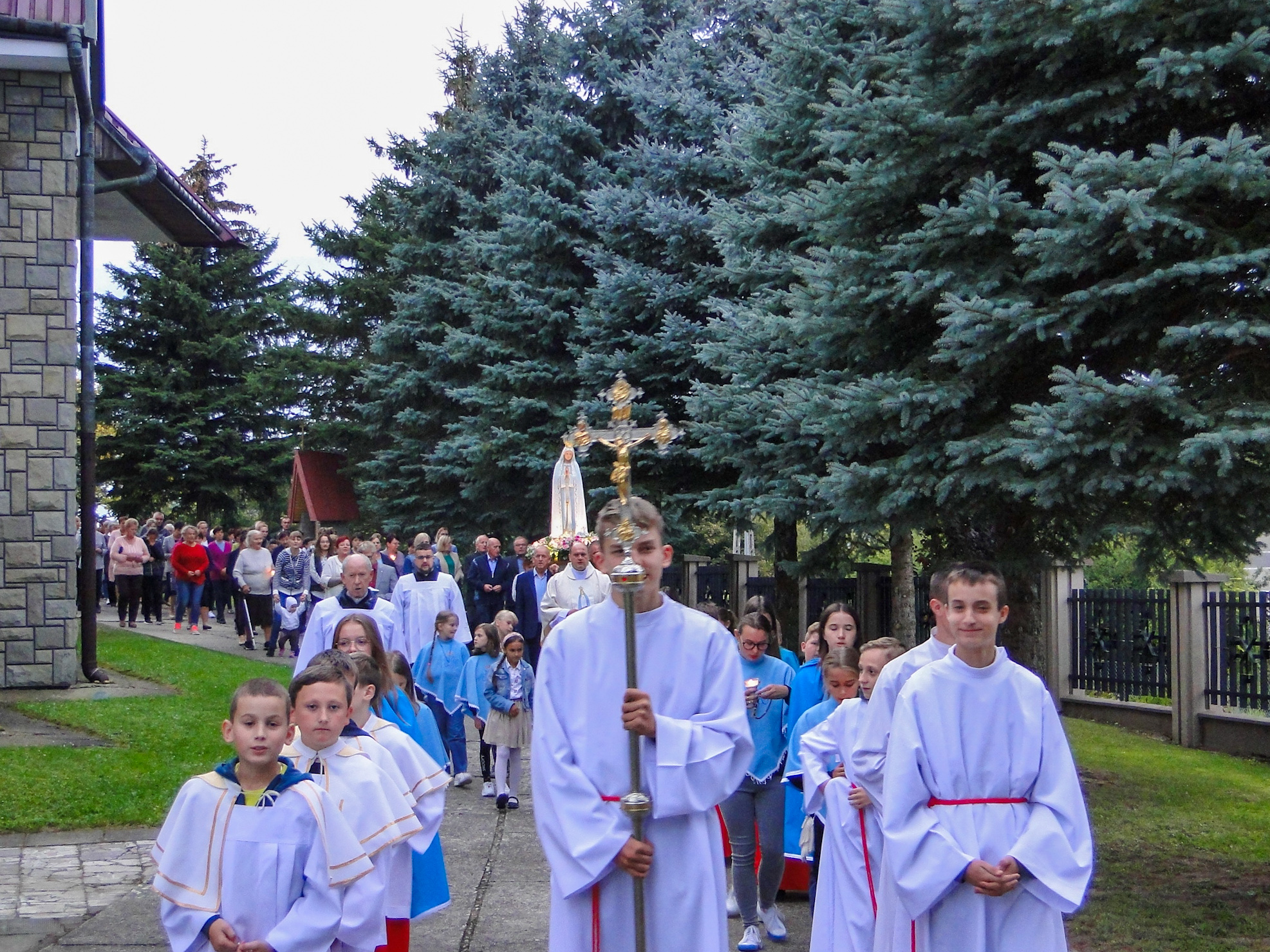 13 września odbyło się kolejne nabożeństwo Fatimskie. Po Mszy Świętej wyruszyliśmy procesją wokół naszego kościoła modląc się Różańcem świętym. Na modlitwie przez wstawiennictwo Matki Bożej polecaliśmy Bogu szczególnie dzieci i młodzież oraz wszystkich trudzących się nad ich wychowaniem. Serdecznie zapraszamy na ostatnie nabożeństwo Fatimskie za miesiąc.