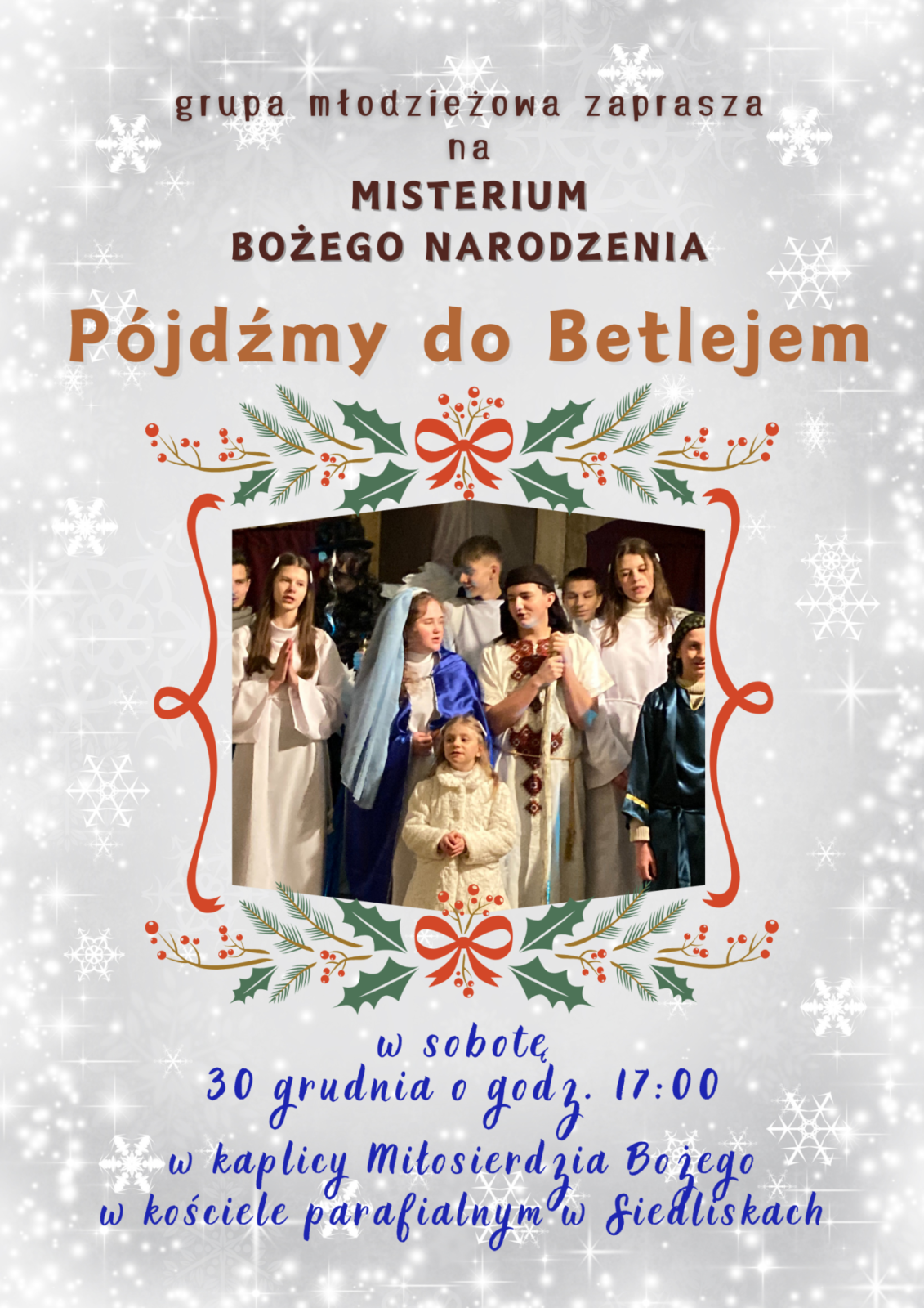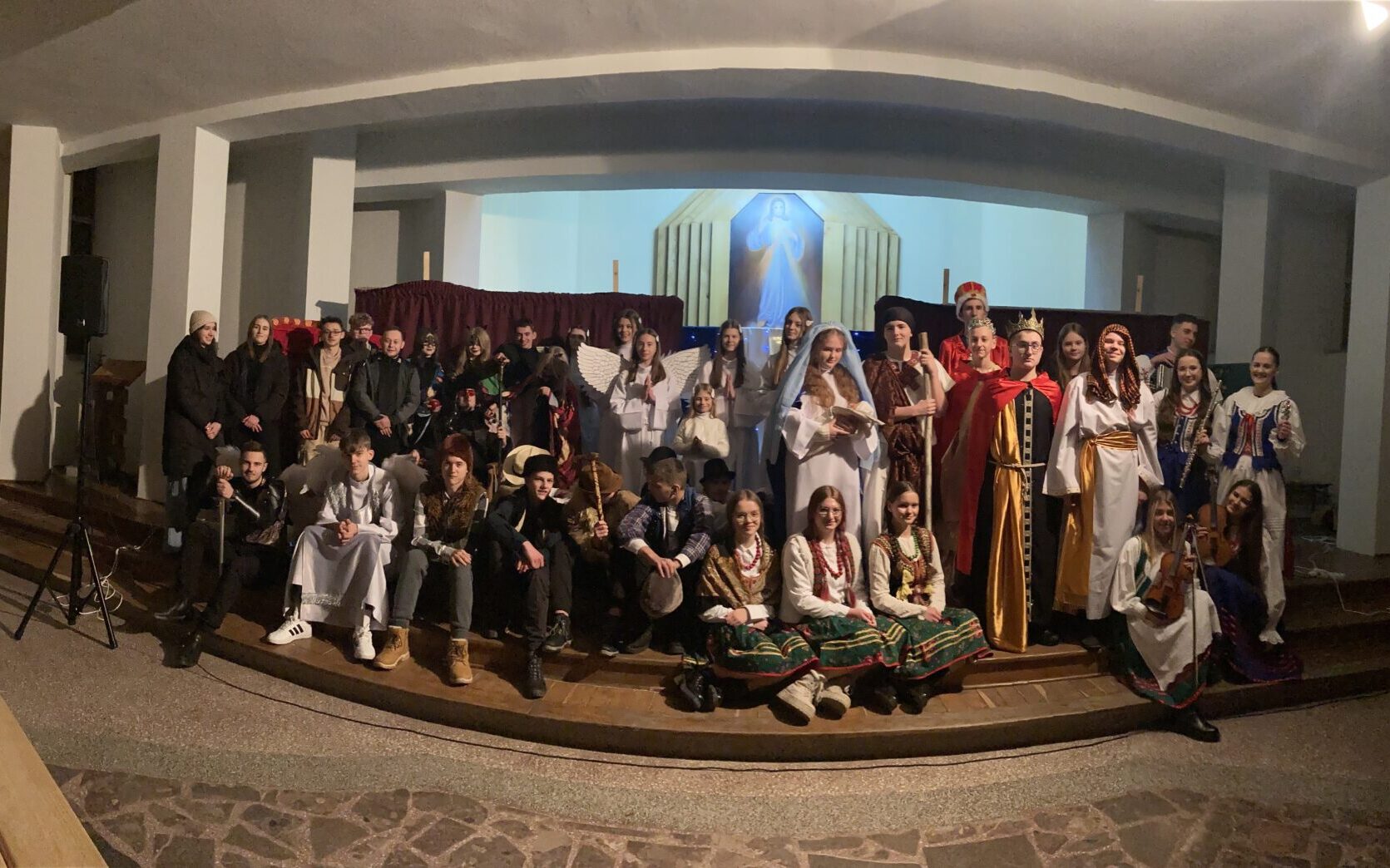 Wieczorem 27 grudnia mieliśmy premierę naszego tegorocznego spektaklu jasełkowego. Kaplica Miłosierdzia Bożego w naszym kościele parafialnym zamieniła się w salę teatralną, zaś na scenie wystąpiła grupa młodzieżowa z inscenizacją „Misterium Bożego Narodzenia. Pójdźmy do Betlejem”. Autorem sztuki jest jezuita, ks. Piotr Turbak. Spektakl składa się z pięciu aktów. Grze aktorów towarzyszy zespół muzyczny, a do śpiewania kolęd – zwłaszcza w ostatniej scenie – zaproszeni zostają również i widzowie.