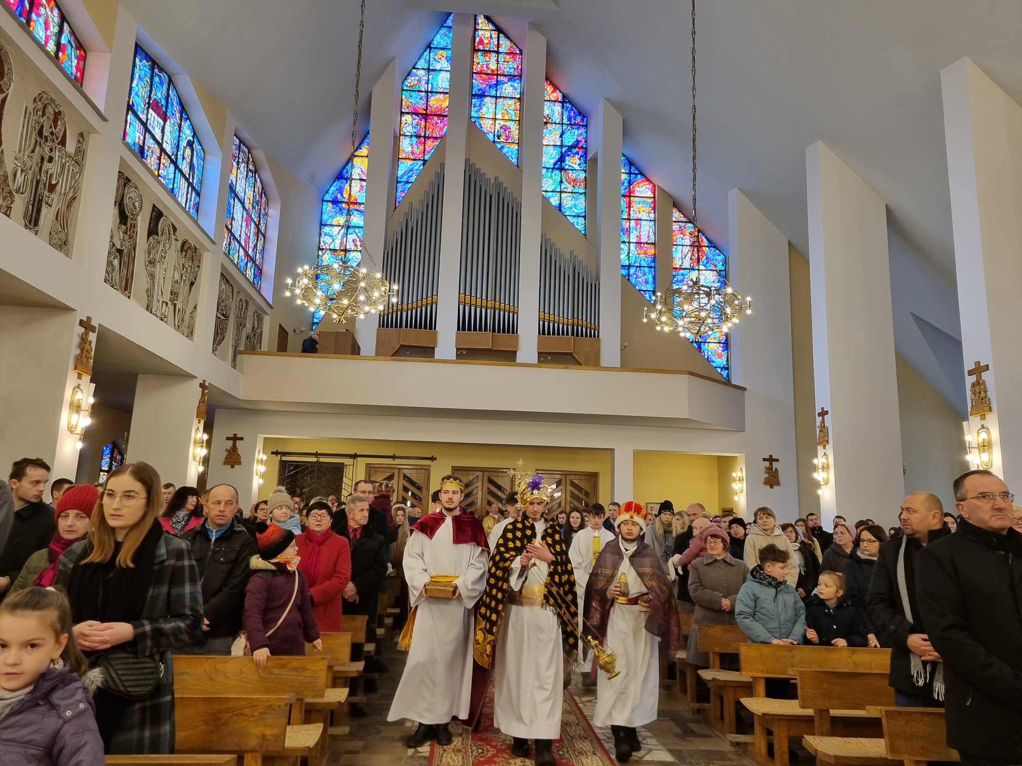 6 stycznia obchodziliśmy uroczystość Objawienia Pańskiego zwane świętem Trzech Króli. Z tej okazji do naszej świątyni przybyli Mędrcy ze wschodu. Królowie byli zaangażowani w liturgię. Przybywszy do Jezusa ofiarowali mu dary: złoto, kadzidło i mirrę. Po mszy Mędrcy ze wschodu udali się do szopki gdzie spotkali się z dziećmi.
