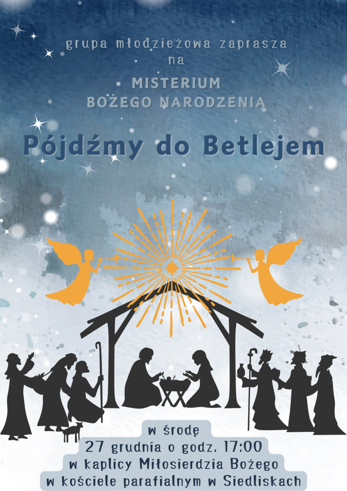 Młodzieżowa Grupa zaprasza na spektakl jasełkowy w środę 27 grudnia o godz. 17:00 w kaplicy Miłosierdzia Bożego w naszym kościele parafialnym